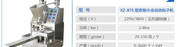 XZ-87S型雙餡斗全自動包子機,可生產(chǎn)各種肉包、肉菜包、菜包、小籠包、湯包、水晶包、圓饅頭、奶黃包、豆沙包、叉燒包、南瓜餅等幾十種包餡制品。適用于賓館、飯店、學校、機關(guān)企業(yè)食堂、饅頭或包子加工廠、早餐工程店及速凍食品廠等單位??蓾M足不同客戶群體。免費提供工藝技術(shù)。免費上門培訓(xùn)指導(dǎo)安裝。
