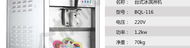 BQL-116臺式冰淇淋機(jī),●選用國際名牌成熟制冷配套件和高效壓縮機(jī),融合旭眾精湛工藝輔以嚴(yán)格的質(zhì)量控制流程,使產(chǎn)品整體性能及品質(zhì)得以全面提升?!癫捎萌珨?shù)字電腦控制系統(tǒng),選用名牌優(yōu)質(zhì)電器元件,先進(jìn)的生產(chǎn)工藝,故障診斷,軟硬任意調(diào)制,自動修復(fù)功能,安全精確,可靠性更高?!駥I(yè)成熟制冷系統(tǒng)設(shè)計(jì),選用世界名牌大功率專用壓縮機(jī),大大縮短冰淇淋成型時間,相同時間內(nèi)冰淇淋產(chǎn)量大幅度增加,使您生意火爆時依然得心應(yīng)手,為您創(chuàng)造財(cái)富。●安全平穩(wěn)的機(jī)械攪拌系統(tǒng),噪音更低、振動更小,使整機(jī)運(yùn)行性能達(dá)到國際先進(jìn)水平?!翊_保進(jìn)料溫度在0°C~35°C;環(huán)境溫度5°C~40°C勻可正常使用。
