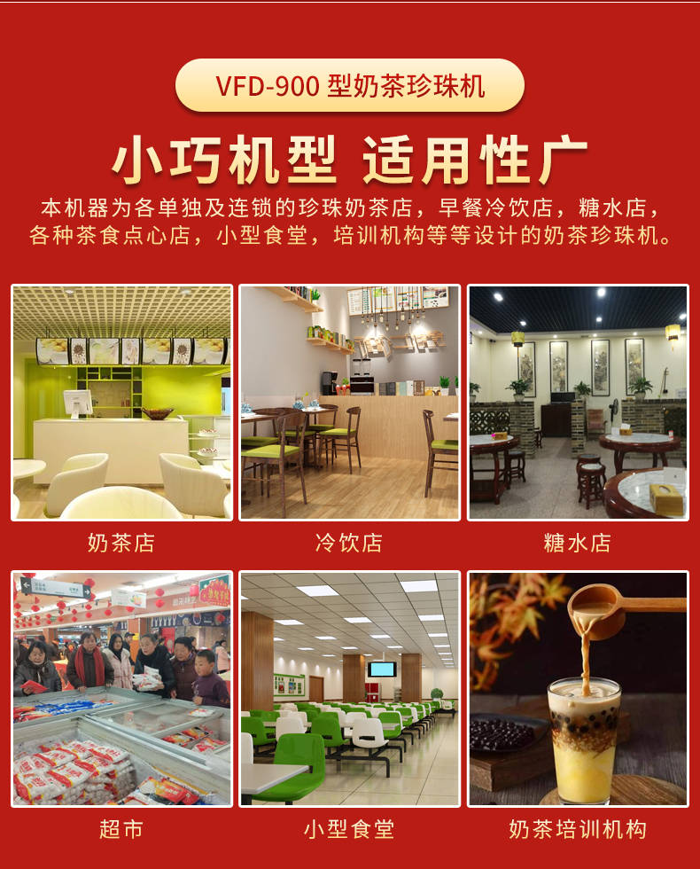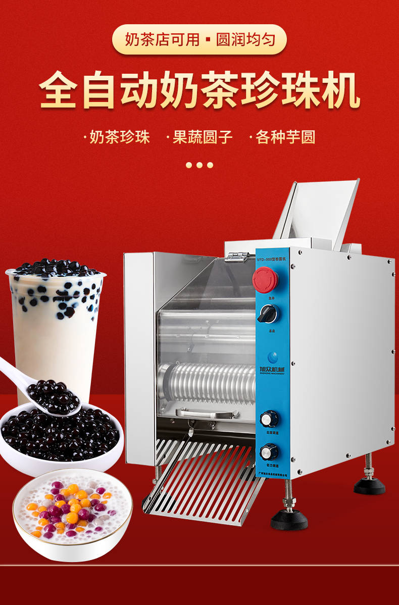 VFD-900珍珠奶茶機,奶茶店、甜品店可用??缮a(chǎn)奶茶珍珠,果蔬圓子,無餡湯圓,水晶湯圓,各種芋圓。不占空間、體積小、重量輕,桌面上的小奶茶珍珠機。告別手工繁瑣的工序,省時省力,輕松解決手工麻煩,成本高等一系列問題