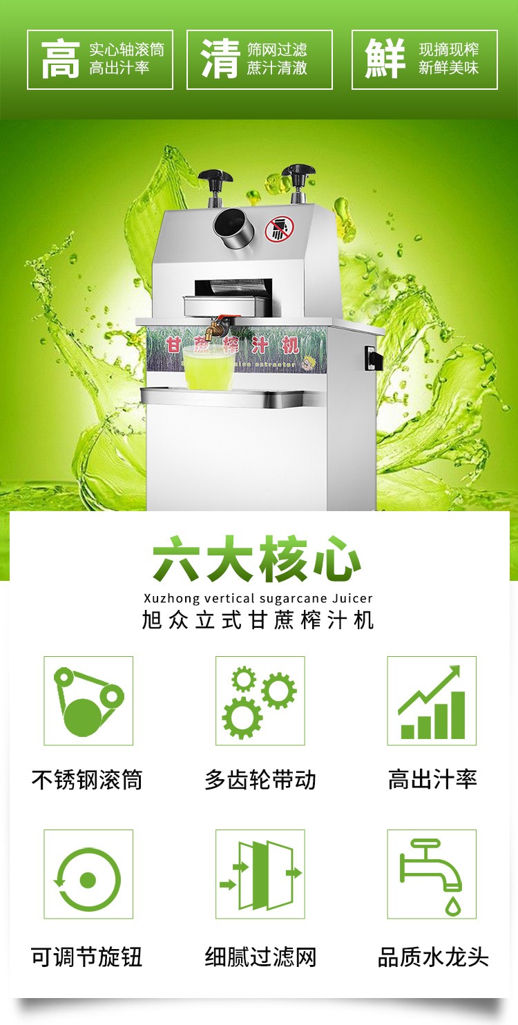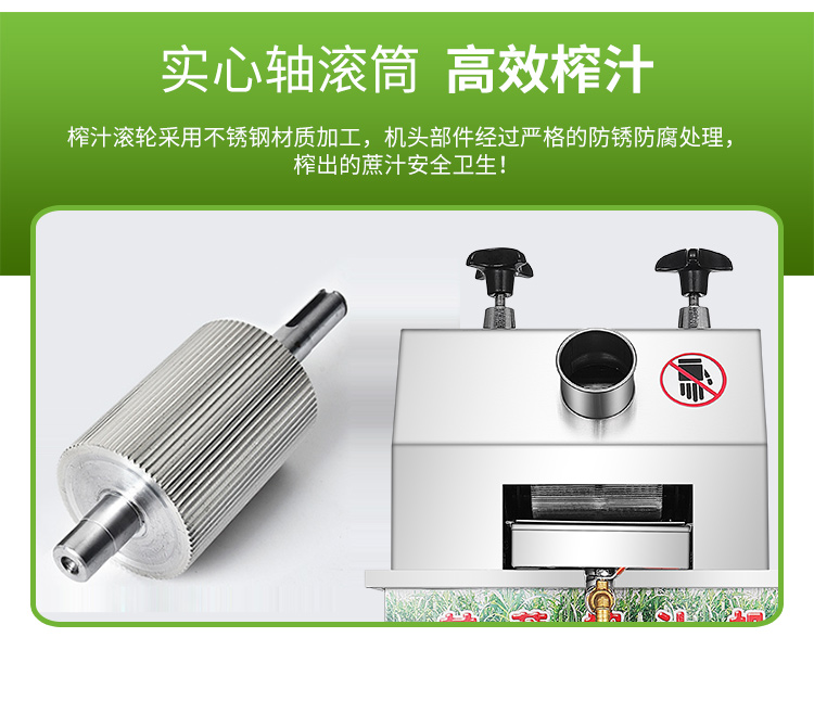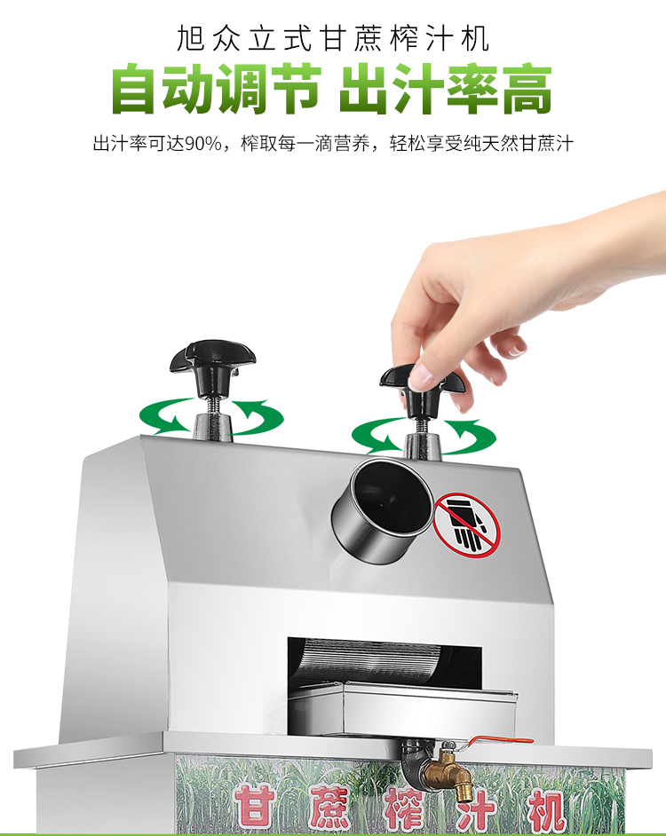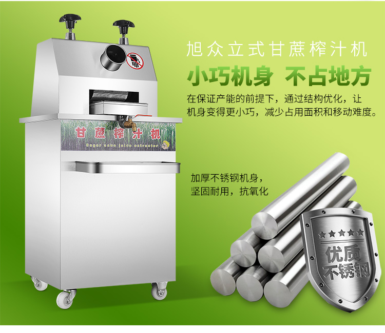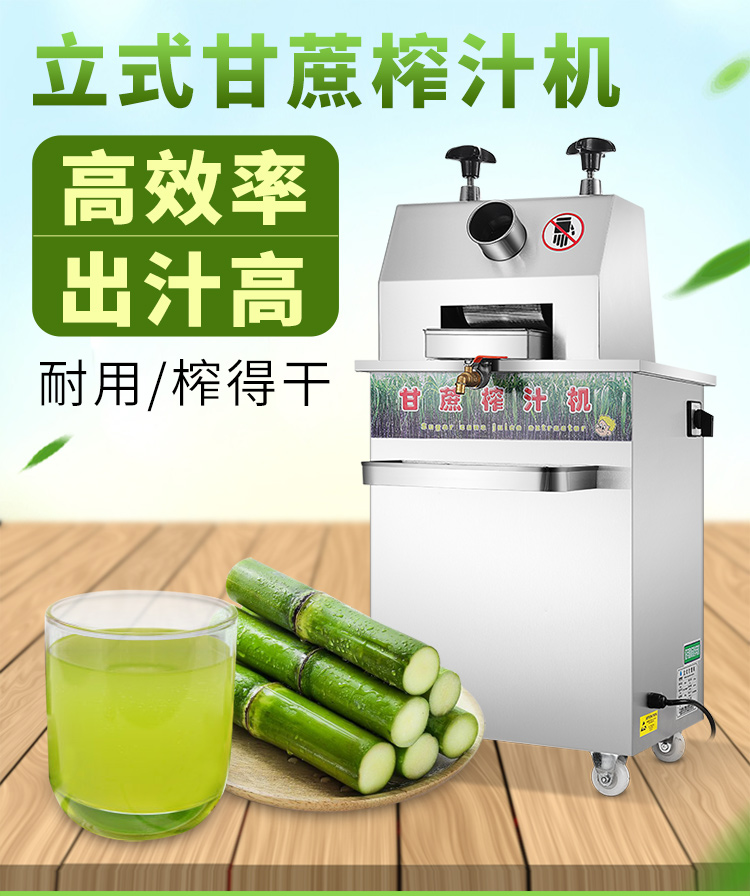 立式甘蔗機(jī),該機(jī)采用不銹鋼材質(zhì)加工,機(jī)頭部件都經(jīng)過(guò)嚴(yán)格的防銹仿腐蝕處理,整機(jī)采用全封閉結(jié)構(gòu),可內(nèi)置蔗渣桶,保證渣汁不外泄,安全、干凈、衛(wèi)生。 適合賓館、卡拉OK廳、水果店、冷飲店、涼茶店、車站、超市等服務(wù)行業(yè)壓榨各種甘蔗之用。