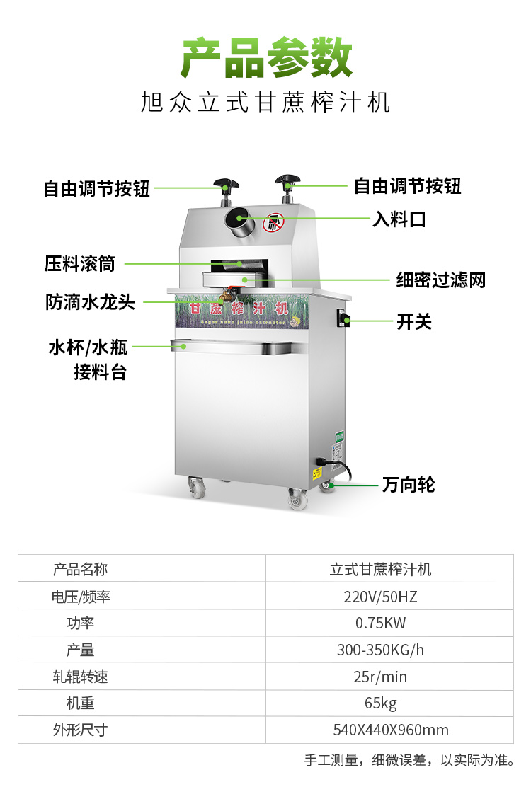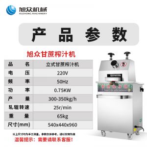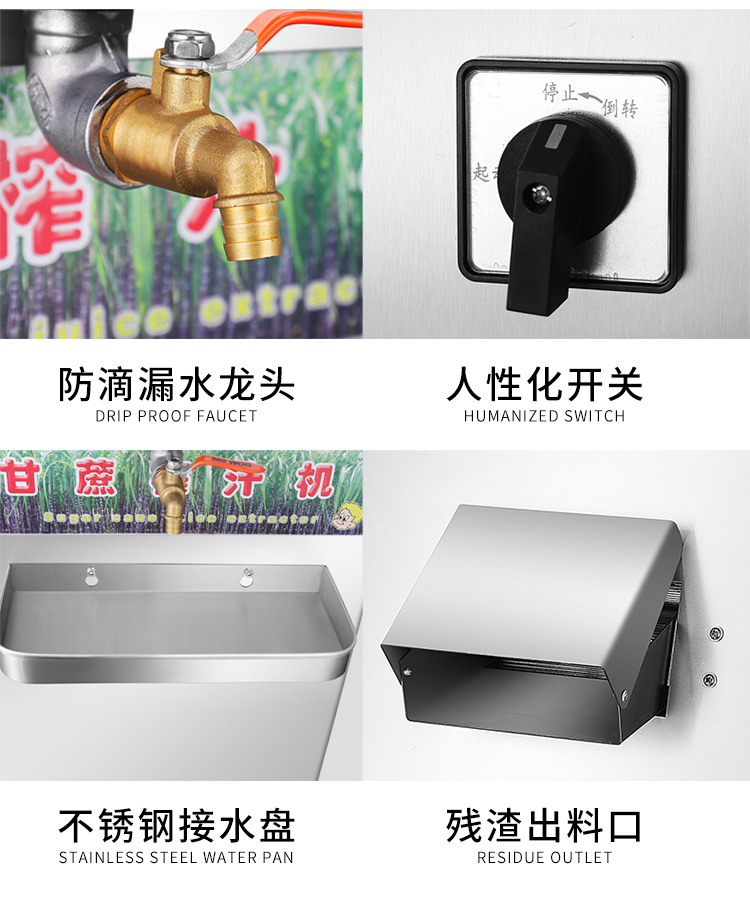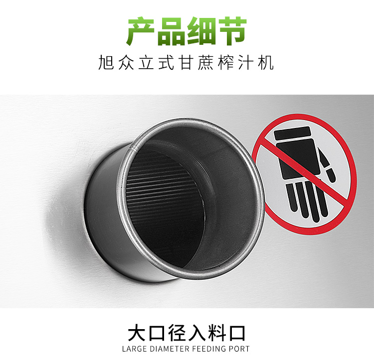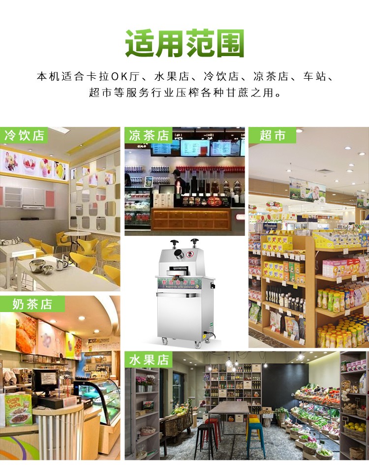 立式甘蔗機(jī),該機(jī)采用不銹鋼材質(zhì)加工,機(jī)頭部件都經(jīng)過(guò)嚴(yán)格的防銹仿腐蝕處理,整機(jī)采用全封閉結(jié)構(gòu),可內(nèi)置蔗渣桶,保證渣汁不外泄,安全、干凈、衛(wèi)生。 適合賓館、卡拉OK廳、水果店、冷飲店、涼茶店、車站、超市等服務(wù)行業(yè)壓榨各種甘蔗之用。