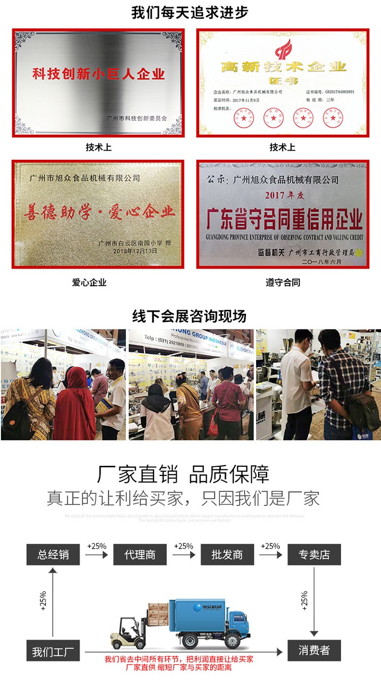 廣州旭眾食品機(jī)械有限公司是一家集科研開發(fā),生產(chǎn)設(shè)計(jì),營(yíng)銷服務(wù)為一體的現(xiàn)代化生產(chǎn)企業(yè)。現(xiàn)代化生產(chǎn)車間,精湛制造技術(shù),所產(chǎn)機(jī)械歷經(jīng)市場(chǎng)重重考驗(yàn),不斷贏得海內(nèi)外客戶的贊譽(yù)。