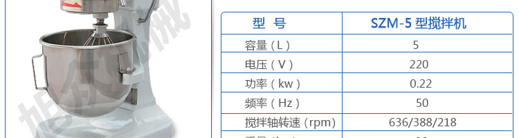 SZM-5型攪拌機,可用于攪拌奶油、蛋糕液、餡料及和制面團等操作。打蛋攪拌機等作攪拌食料、揉和面團之用,是生產(chǎn)優(yōu)質(zhì)糕點的理想設(shè)備,適用于酒店、飯店、學(xué)校部門、面包屋以及食品廠家。