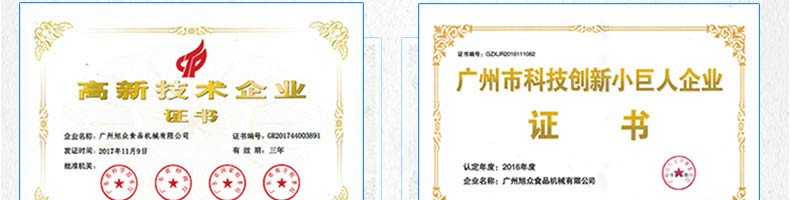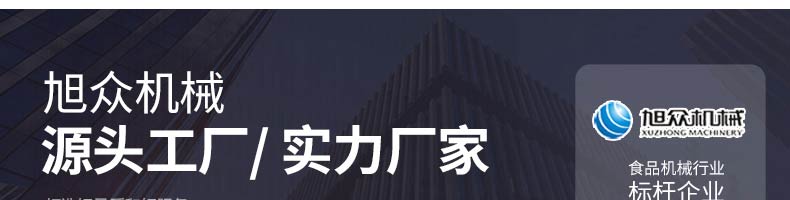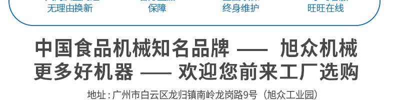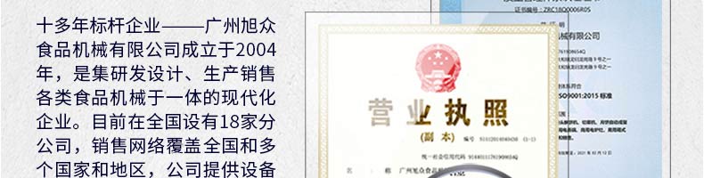廣州旭眾食品機(jī)械有限公司是一家集科研開發(fā),生產(chǎn)設(shè)計(jì),營銷服務(wù)為一體的現(xiàn)代化生產(chǎn)企業(yè)?,F(xiàn)代化生產(chǎn)車間,精湛制造技術(shù),所產(chǎn)機(jī)械歷經(jīng)市場(chǎng)重重考驗(yàn),不斷贏得海內(nèi)外客戶的贊譽(yù)。