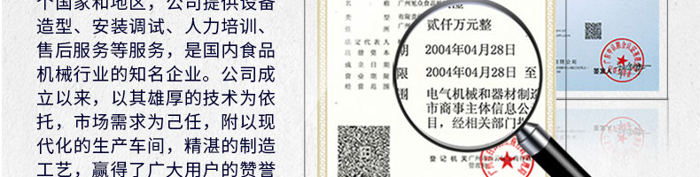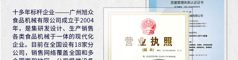 廣州旭眾食品機(jī)械有限公司是一家集科研開發(fā),生產(chǎn)設(shè)計(jì),營(yíng)銷服務(wù)為一體的現(xiàn)代化生產(chǎn)企業(yè)?,F(xiàn)代化生產(chǎn)車間,精湛制造技術(shù),所產(chǎn)機(jī)械歷經(jīng)市場(chǎng)重重考驗(yàn),不斷贏得海內(nèi)外客戶的贊譽(yù)。