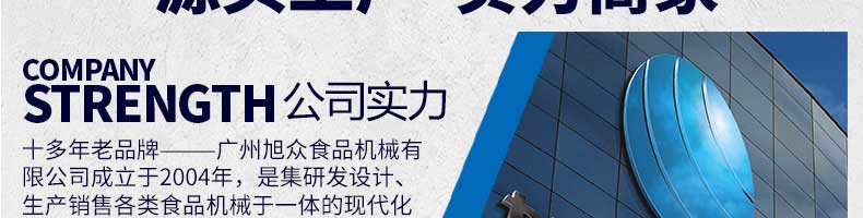 廣州旭眾食品機械有限公司是一家集科研開發(fā),生產(chǎn)設(shè)計,營銷服務(wù)為一體的現(xiàn)代化生產(chǎn)企業(yè)?,F(xiàn)代化生產(chǎn)車間,精湛制造技術(shù),所產(chǎn)機械歷經(jīng)市場重重考驗,不斷贏得海內(nèi)外客戶的贊譽。