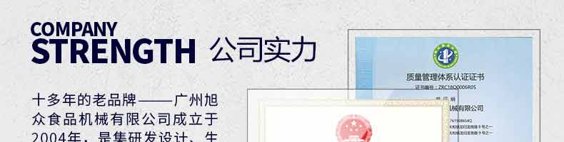 廣州旭眾食品機械有限公司是一家集科研開發(fā),生產(chǎn)設計,營銷服務為一體的現(xiàn)代化生產(chǎn)企業(yè)?,F(xiàn)代化生產(chǎn)車間,精湛制造技術,所產(chǎn)機械歷經(jīng)市場重重考驗,不斷贏得海內(nèi)外客戶的贊譽。