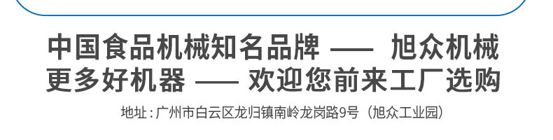 廣州旭眾食品機械有限公司是一家集科研開發(fā),生產設計,營銷服務為一體的現(xiàn)代化生產企業(yè)?,F(xiàn)代化生產車間,精湛制造技術,所產機械歷經(jīng)市場重重考驗,不斷贏得海內外客戶的贊譽。