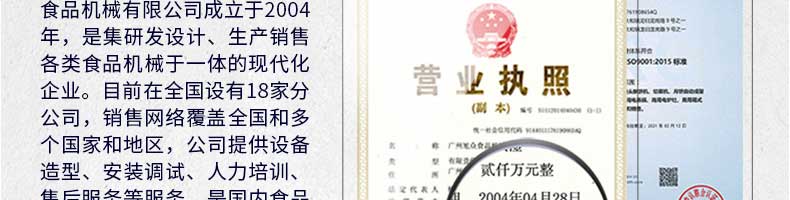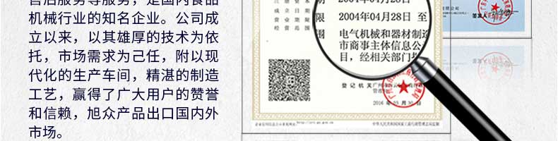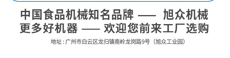 廣州旭眾食品機械有限公司是一家集科研開發(fā),生產(chǎn)設(shè)計,營銷服務(wù)為一體的現(xiàn)代化生產(chǎn)企業(yè)?,F(xiàn)代化生產(chǎn)車間,精湛制造技術(shù),所產(chǎn)機械歷經(jīng)市場重重考驗,不斷贏得海內(nèi)外客戶的贊譽。