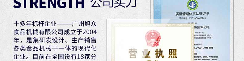 廣州旭眾食品機械有限公司是一家集科研開發(fā),生產(chǎn)設計,營銷服務為一體的現(xiàn)代化生產(chǎn)企業(yè)?,F(xiàn)代化生產(chǎn)車間,精湛制造技術,所產(chǎn)機械歷經(jīng)市場重重考驗,不斷贏得海內(nèi)外客戶的贊譽。