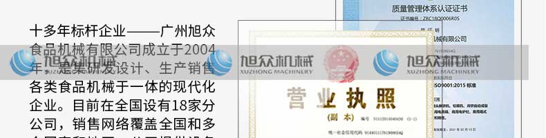 廣州旭眾食品機械有限公司是一家集科研開發(fā),生產(chǎn)設計,營銷服務為一體的現(xiàn)代化生產(chǎn)企業(yè)。現(xiàn)代化生產(chǎn)車間,精湛制造技術,所產(chǎn)機械歷經(jīng)市場重重考驗,不斷贏得海內(nèi)外客戶的贊譽。