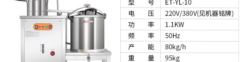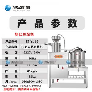 ET-YL-09壓力電熱豆?jié){機(jī),多功能商用豆?jié){機(jī),細(xì)、香、濃。我們珍惜每一顆大豆,讓每顆大豆進(jìn)發(fā)營養(yǎng)價值。旭眾豆?jié){機(jī)做您的招牌豆?jié){打磨細(xì)膩、口感香濃、回味無窮。