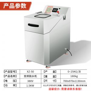 XZ-50型脫水機,蔬菜脫水食品甩干,變頻控制、方便快捷。速度調(diào)頻,脫水速度可根據(jù)不同產(chǎn)品需求調(diào)節(jié)不同速度。鈑金機身,機架鈑金是 2MM 厚,使整機運行時更穩(wěn)定,噪音更小。