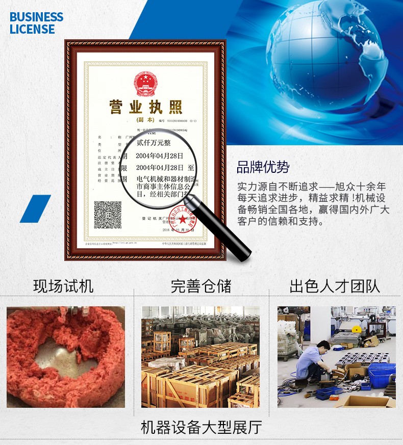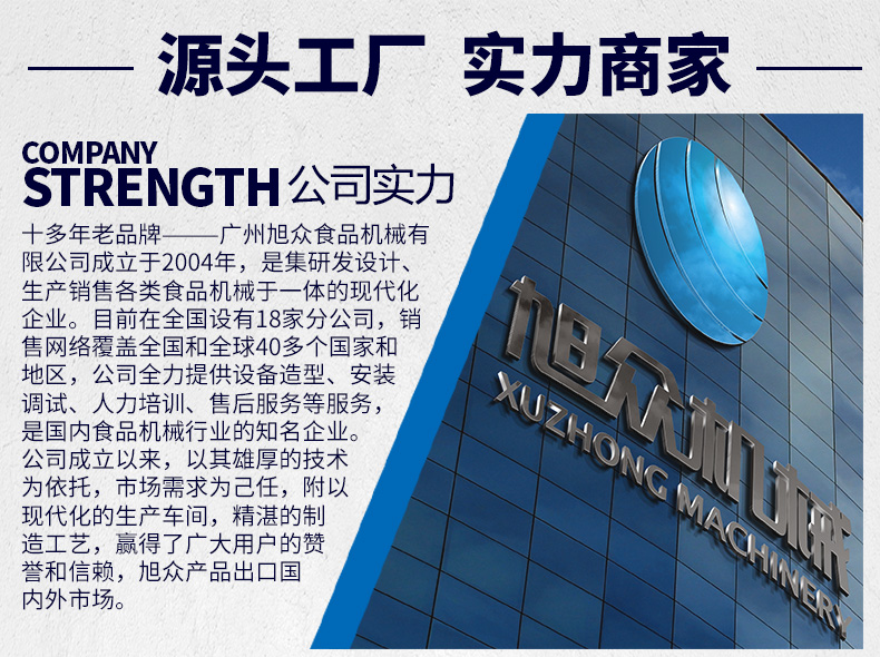 廣州旭眾食品機(jī)械有限公司是一家集科研開(kāi)發(fā),生產(chǎn)設(shè)計(jì),營(yíng)銷(xiāo)服務(wù)為一體的現(xiàn)代化生產(chǎn)企業(yè)?,F(xiàn)代化生產(chǎn)車(chē)間,精湛制造技術(shù),所產(chǎn)機(jī)械歷經(jīng)市場(chǎng)重重考驗(yàn),不斷贏得海內(nèi)外客戶(hù)的贊譽(yù)。