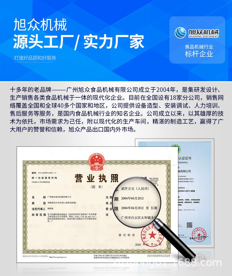 廣州旭眾食品機(jī)械有限公司是一家集科研開發(fā),生產(chǎn)設(shè)計(jì),營銷服務(wù)為一體的現(xiàn)代化生產(chǎn)企業(yè)?,F(xiàn)代化生產(chǎn)車間,精湛制造技術(shù),所產(chǎn)機(jī)械歷經(jīng)市場重重考驗(yàn),不斷贏得海內(nèi)外客戶的贊譽(yù)。