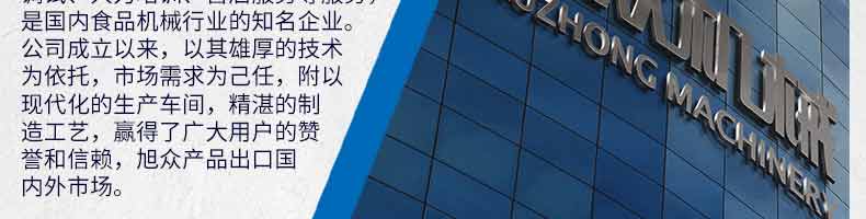 廣州旭眾食品機械有限公司是一家集科研開發(fā),生產(chǎn)設(shè)計,營銷服務(wù)為一體的現(xiàn)代化生產(chǎn)企業(yè)。現(xiàn)代化生產(chǎn)車間,精湛制造技術(shù),所產(chǎn)機械歷經(jīng)市場重重考驗,不斷贏得海內(nèi)外客戶的贊譽。