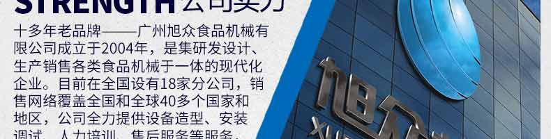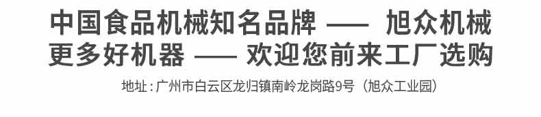 廣州旭眾食品機械有限公司是一家集科研開發(fā),生產設計,營銷服務為一體的現(xiàn)代化生產企業(yè)?,F(xiàn)代化生產車間,精湛制造技術,所產機械歷經市場重重考驗,不斷贏得海內外客戶的贊譽。