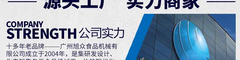 廣州旭眾食品機械有限公司是一家集科研開發(fā),生產(chǎn)設計,營銷服務為一體的現(xiàn)代化生產(chǎn)企業(yè)?,F(xiàn)代化生產(chǎn)車間,精湛制造技術,所產(chǎn)機械歷經(jīng)市場重重考驗,不斷贏得海內外客戶的贊譽。