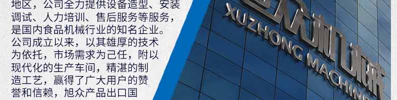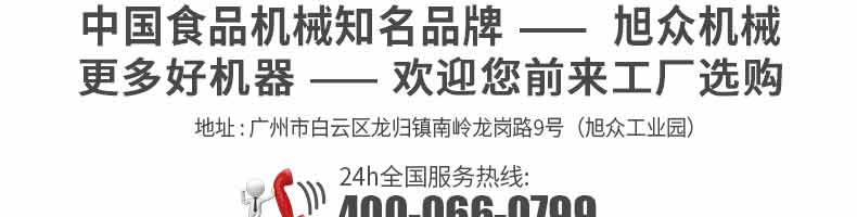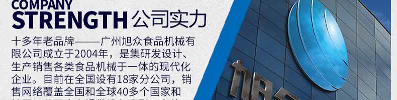 廣州旭眾食品機械有限公司是一家集科研開發(fā),生產設計,營銷服務為一體的現(xiàn)代化生產企業(yè)?,F(xiàn)代化生產車間,精湛制造技術,所產機械歷經市場重重考驗,不斷贏得海內外客戶的贊譽。