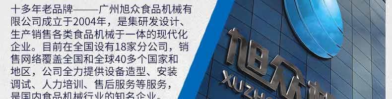 廣州旭眾食品機(jī)械有限公司是一家集科研開(kāi)發(fā),生產(chǎn)設(shè)計(jì),營(yíng)銷(xiāo)服務(wù)為一體的現(xiàn)代化生產(chǎn)企業(yè)?,F(xiàn)代化生產(chǎn)車(chē)間,精湛制造技術(shù),所產(chǎn)機(jī)械歷經(jīng)市場(chǎng)重重考驗(yàn),不斷贏得海內(nèi)外客戶的贊譽(yù)。