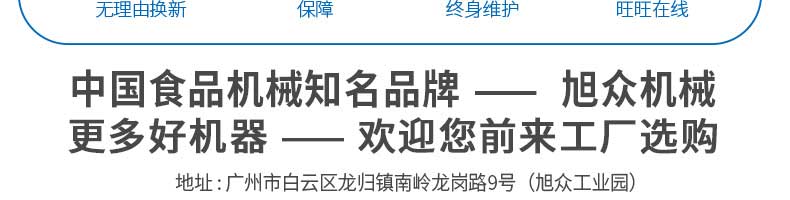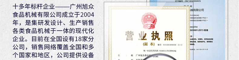 廣州旭眾食品機械有限公司是一家集科研開發(fā),生產(chǎn)設計,營銷服務為一體的現(xiàn)代化生產(chǎn)企業(yè)?,F(xiàn)代化生產(chǎn)車間,精湛制造技術,所產(chǎn)機械歷經(jīng)市場重重考驗,不斷贏得海內(nèi)外客戶的贊譽。