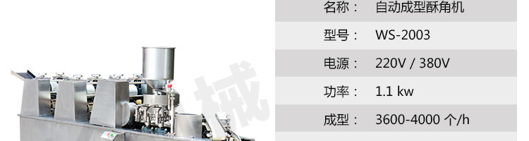 WS-2003 型自動(dòng)成型酥角機(jī)(油餃機(jī)),適用于制作酥角、油餃,可包的餡有:花生、椰蓉、白糖等。適合多種面粉材料、并且成型封口美觀(guān)牢固。小模約47mm,大模約57mm隨機(jī)標(biāo)配一套模具。購(gòu)機(jī)贈(zèng)送工藝配方。