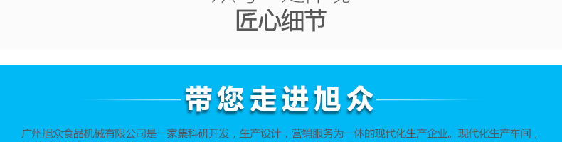 廣州旭眾食品機械有限公司是一家集科研開發(fā),生產(chǎn)設計,營銷服務為一體的現(xiàn)代化生產(chǎn)企業(yè)?,F(xiàn)代化生產(chǎn)車間,精湛制造技術,所產(chǎn)機械歷經(jīng)市場重重考驗,不斷贏得海內(nèi)外客戶的贊譽。