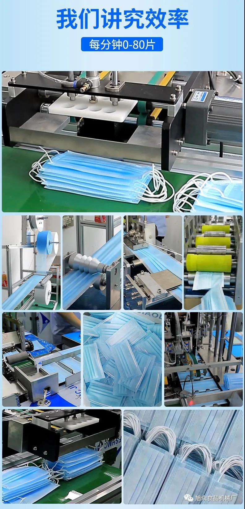 旭眾牌一拖二口罩機(jī)由一臺(tái)本體機(jī)帶動(dòng)兩臺(tái)耳帶機(jī)組成。本體機(jī)輸出ロ罩本體后,由輸送帶結(jié)構(gòu)將口罩本體片輸送到連接耳帶機(jī)的輸送帶上,再通過(guò)輸送帶將口罩片輸送到耳帶機(jī)的正面第一個(gè)口罩盤(pán)上方,最后通過(guò)氣缸下壓把口罩片放置到耳帶機(jī)的口罩盤(pán)內(nèi),后續(xù)由耳帶機(jī)完成口罩的耳帶熔接,包邊等動(dòng)作,從而完成一個(gè)耳帶口罩產(chǎn)品的生產(chǎn)。本機(jī)采用PLC、觸摸屏控制、主傳送帶采用單相馬達(dá)輸送、步進(jìn)馬達(dá)翻轉(zhuǎn),傳動(dòng)精確,控制穩(wěn)定,速度可調(diào)。