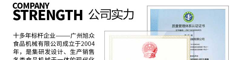 廣州旭眾食品機(jī)械有限公司是一家集科研開(kāi)發(fā),生產(chǎn)設(shè)計(jì),營(yíng)銷(xiāo)服務(wù)為一體的現(xiàn)代化生產(chǎn)企業(yè)。現(xiàn)代化生產(chǎn)車(chē)間,精湛制造技術(shù),所產(chǎn)機(jī)械歷經(jīng)市場(chǎng)重重考驗(yàn),不斷贏得海內(nèi)外客戶的贊譽(yù)。